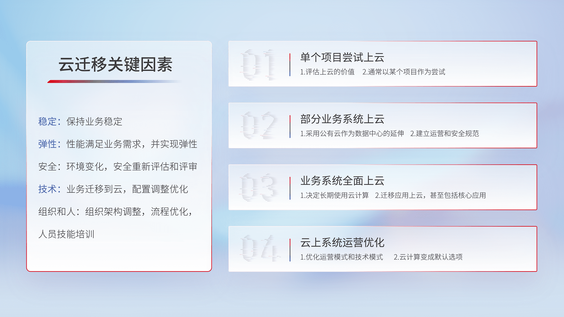 结合实际业务,,,从规划设计、、云平台选型、、、云原生改造、、、数据迁移、、、、集成交付,,迁移全过程为客户识别最佳上云路径,,,做好风险识别管理,,,设计网络架构、、身份权限、、安全审计合规、、操作审计、、日志审计、、监控告警策略、、、、多站点容灾设计等,,,对云上基础设施进行整体规划,,,,提升IT治理水平,,,以满足弹性、、高可用、、高性能的需求。。。