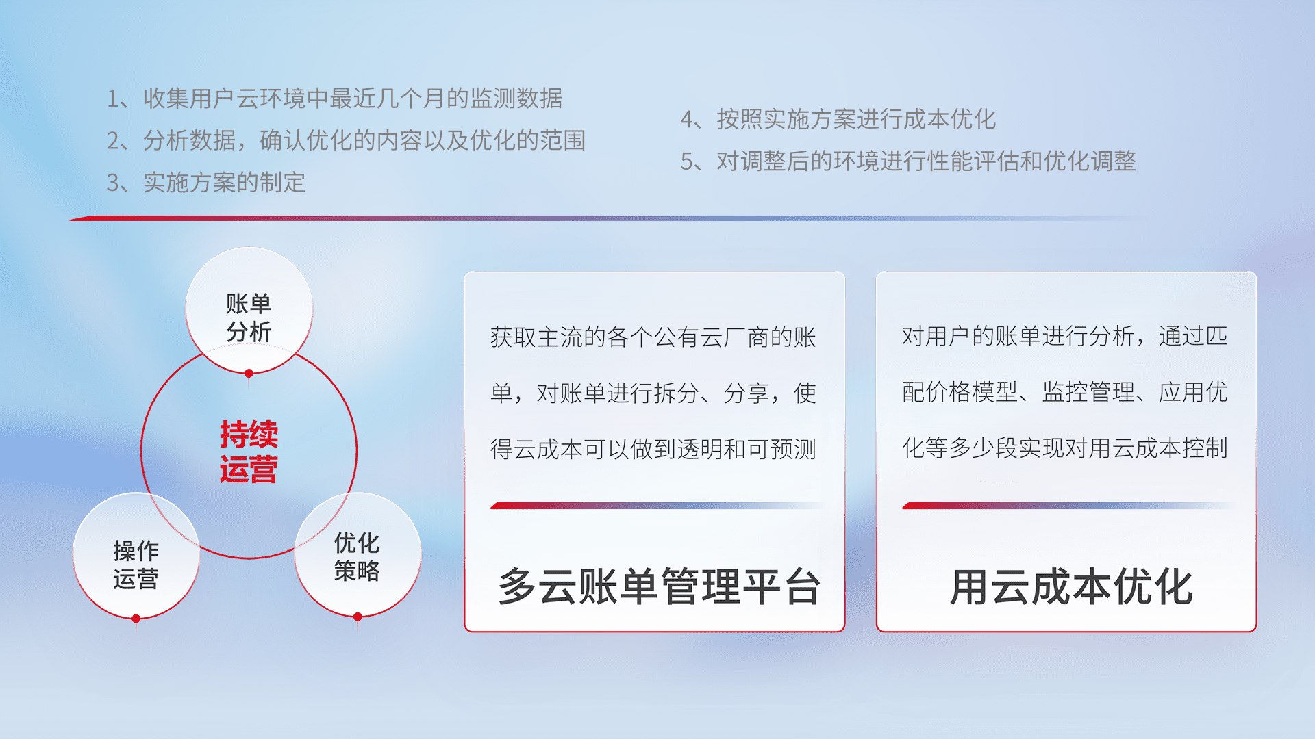通过多云纳管,,,,以统一的资源数据模型把客户的云资源进行抽象和封装,,,进而实现对多云资源的统一操作,,保障云资源管理的可靠性、、、稳定性与可用性。。量身定制化运维内容,,,配置、、、开发运维、、、补丁管理、、、、备份、、、、监控、、认证和访问管理、、审计和日常巡检等,,,保障在用云过程中的可靠度,,稳定度以及高可用率。。。。
