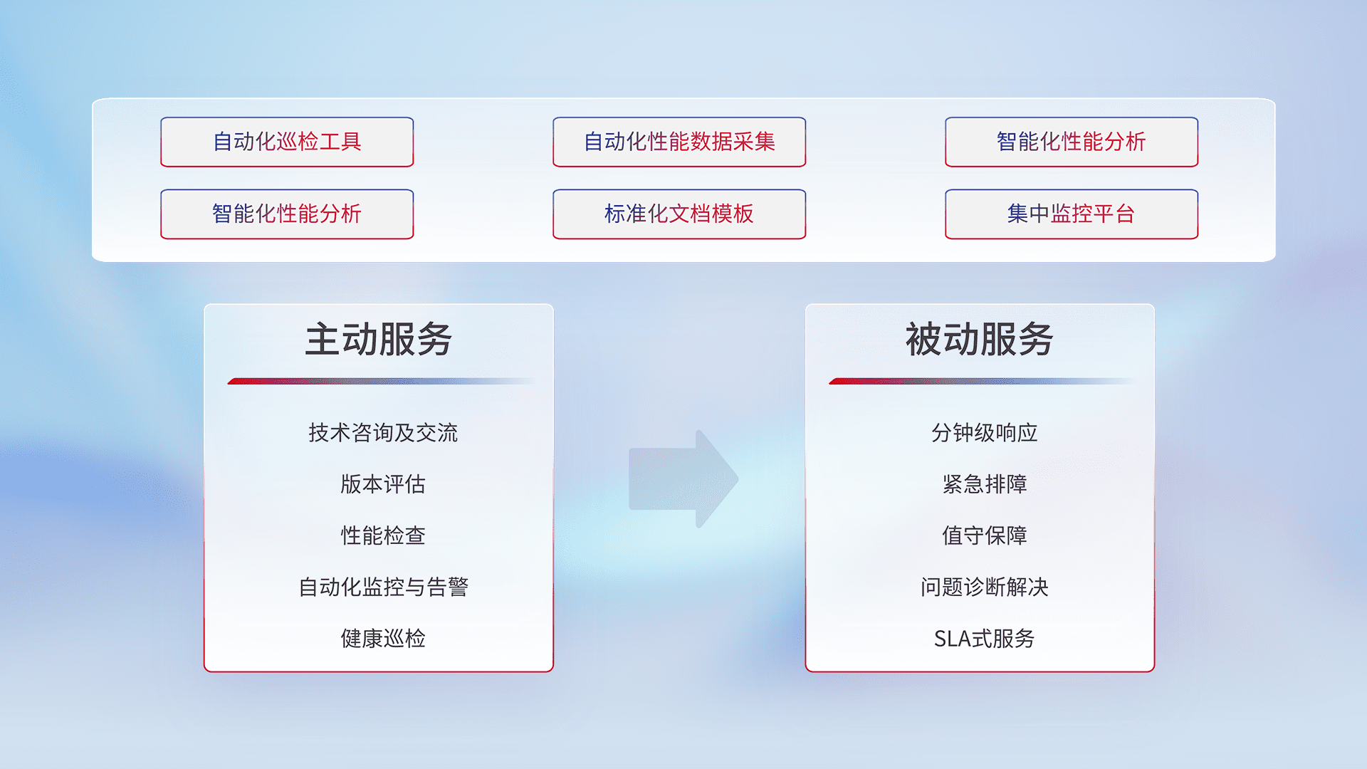 智能化工具和标准化文档,,,,保障服务质量,,,,提供主动服务(包含技术咨询、、版本评估、、、性能检查、、自动化监控与告警、、健康巡检)和被动服务包含(分钟级响应、、紧急排障、、、、值守保障、、问题诊断解决、、、SLA服务)。。